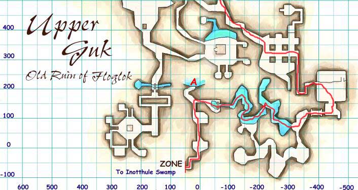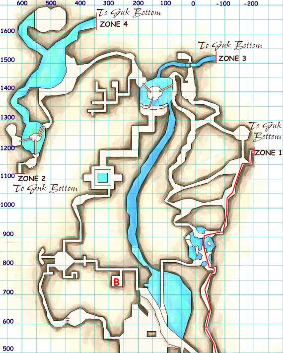 Zone to Lower Guk at ZONE 1 on the map. Your 1st goal is to get to the area marked 'C', where you will jump down and head thru the tunnel to the North.